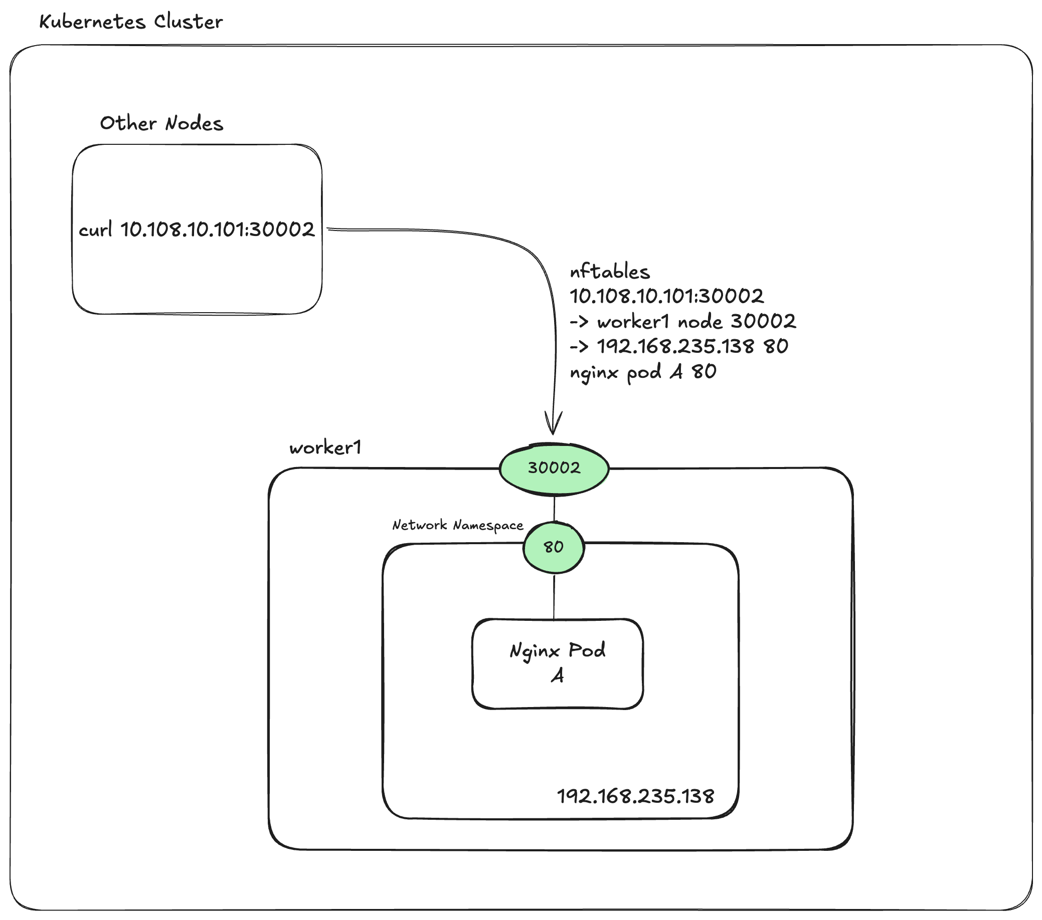 그러나 쿠버네티스는 성능 등의 이유로 iptables를 nftables로 점진적 전환하는 상태이고, 1.31 버전에서는 NodePort 규칙의 경우 nftables를 통해 구성되어 있습니다.