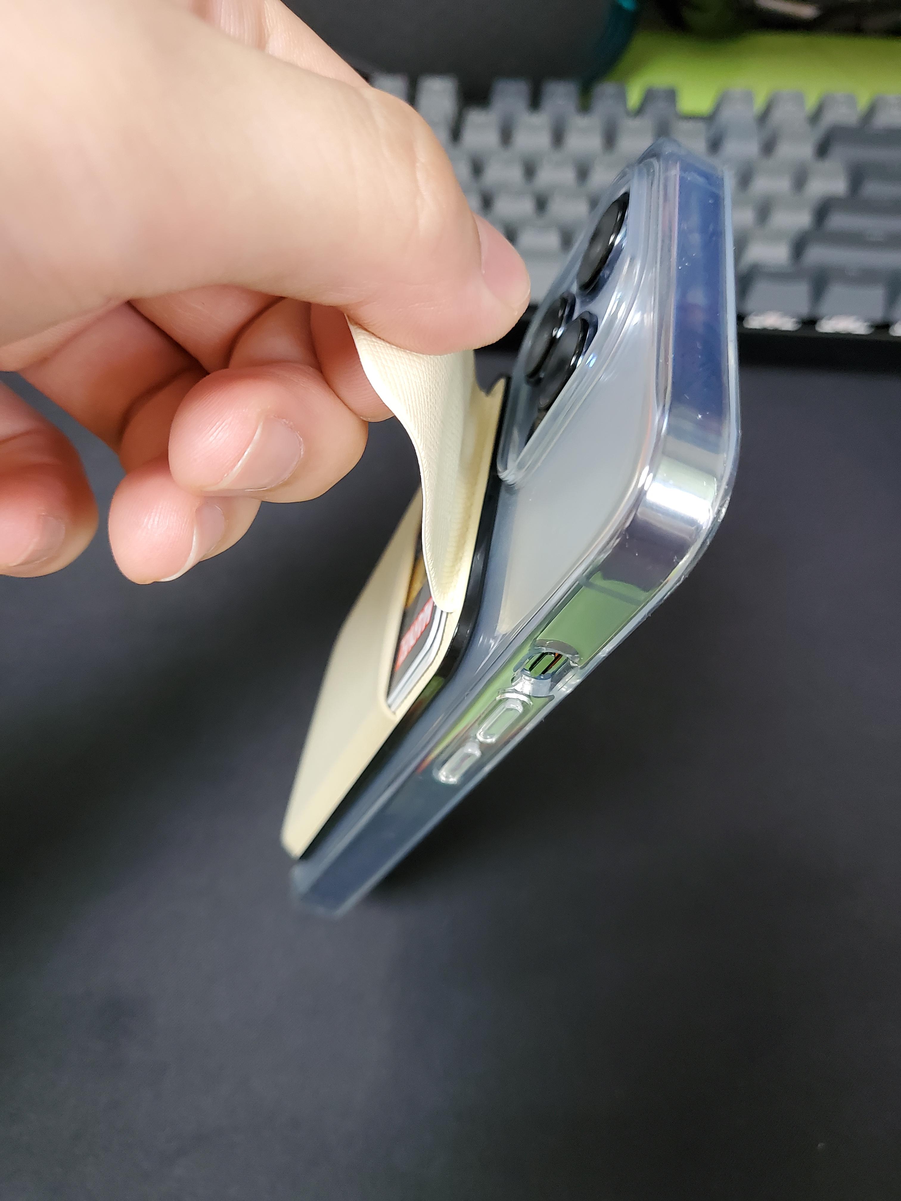 시블 맥세이프 케이스에 착용한 모습이다. 자력은 진짜 강한데, 오른쪽 사진처럼 들고 있어도 안떨어진다.