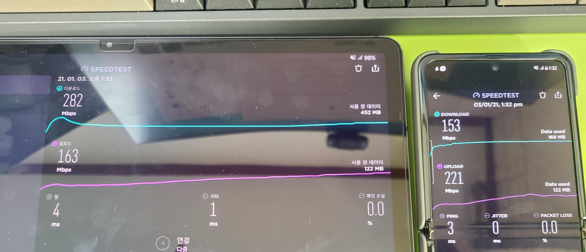 양 기기간에 발생하는 최대속도 차이는 기기차이인 것 같다. Z Flip은 아무리 해도 330Mbps를 넘는 경우가 없었고, S7+는 최대 500Mbps까지 나왔다.