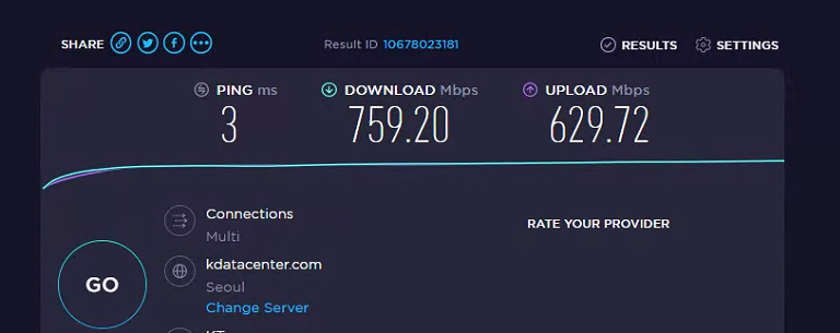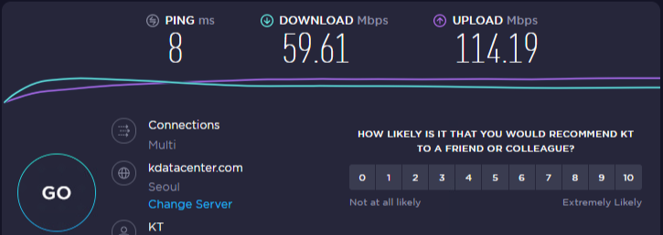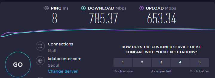 총 10번 시도 했을 때 평균 다운로드: 750Mbps 업로드: 625Mbps를 유지했다. 과거 1기가급 광랜이 많이 보급되지 않았을 때는 1.1Gbps도 나오곤 했는데, 보급이 많이 됨에 따라 속도가 많이 떨어졌다. (이건 KT에서 보상해야하는 것 아닌가?)