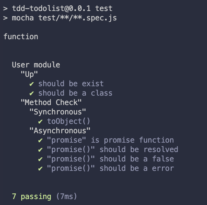 이제 작성한 test/user.spec.js가 잘 되는지 확인하면 된다. 명령어는 우리가 package-.json에 작성해 놓은대로, npm test명령어를 통해 수행할 수 있다.