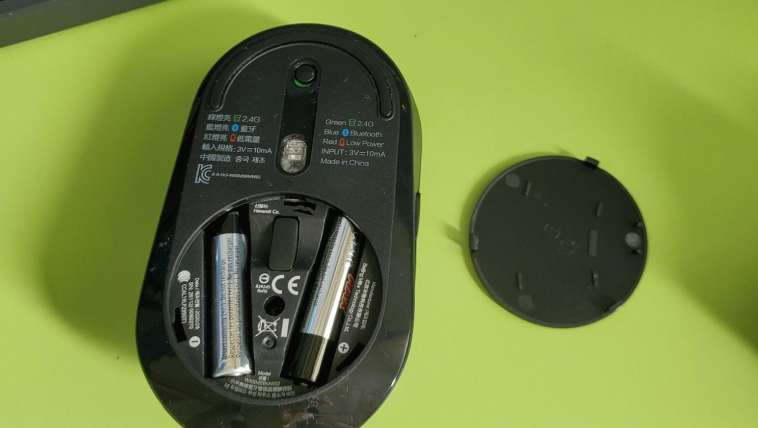 이후에 건전지를 넣어주면 된다. 건전지 사이에 보이는 동글이가 리시버다. 사용하고자 하는 데스크탑이나 노트북 등 USB를 꽂으면 연결된다.