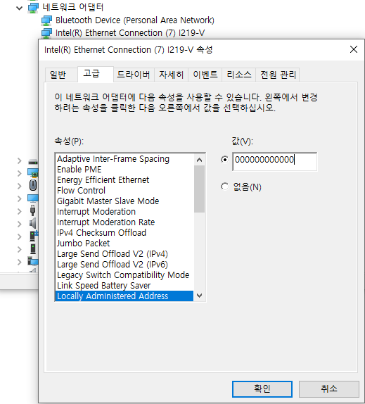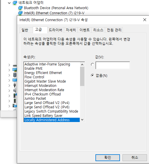 장치관리자 - 랜 카드 - 네트워크 주소(Locally Administered Address)