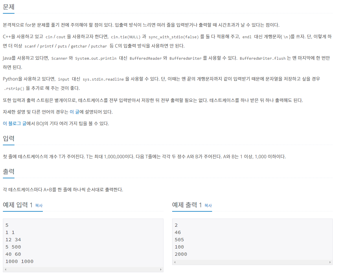 백준 15552번 빠른 A+B 풀이를 하려 한다. 이 문제에 빠른이라는 특징이 붙은 이유는 시간 제한이 있기 때문이다.