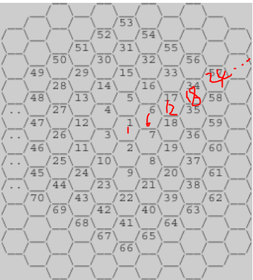 벌집의 겉에는 원자의 전자껍질과 같은 구조를 발견할 수 있다. 심지어 해당 껍질은 등비수열을 이룬다. 그리고 제일 안쪽 껍질은 무조건 밟아야 함에 착안해서, 두 번째 껍질의 시작을 1로 맞춰주면 문제를 풀기 더 쉽다.